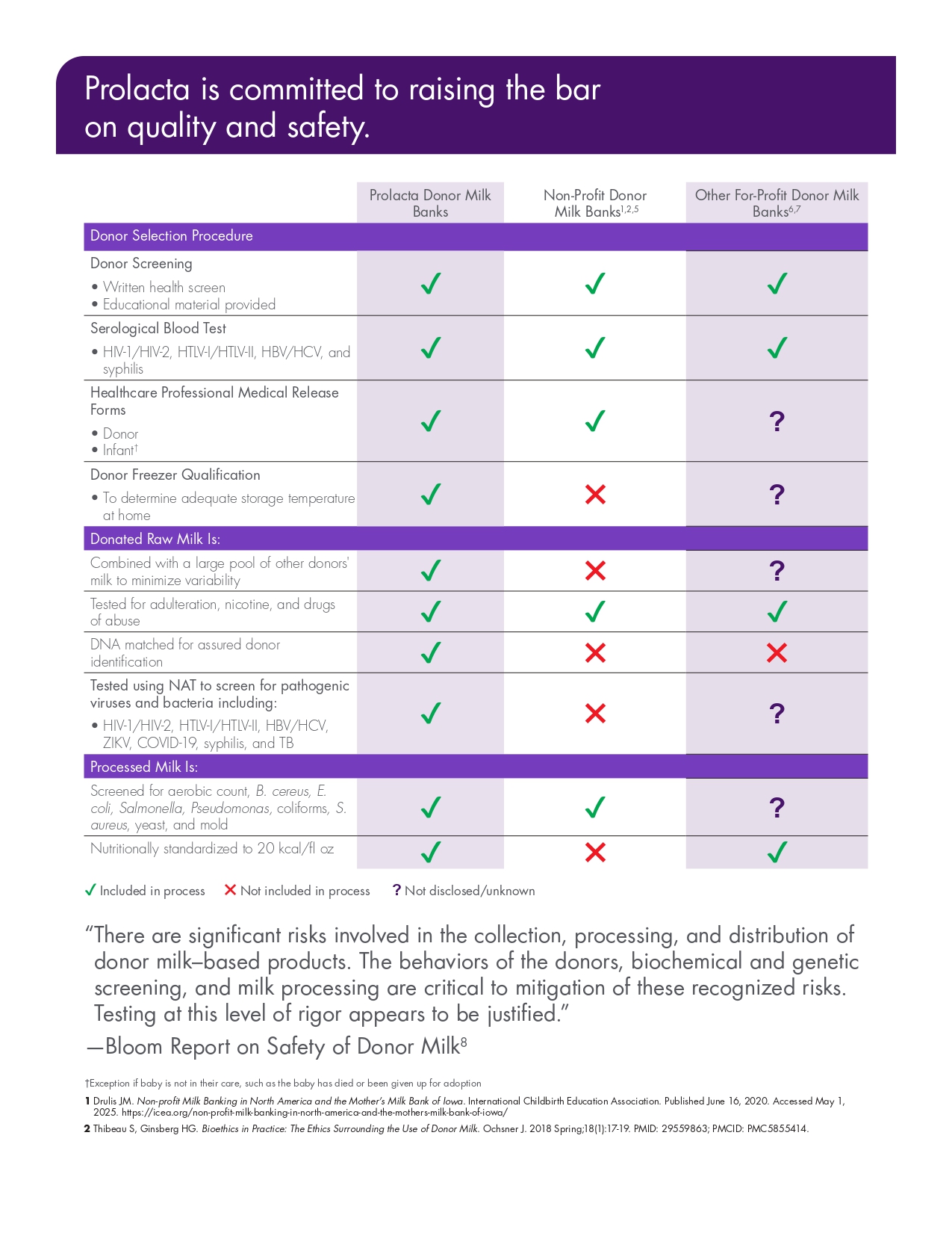 Every milk donation is DNA-matched to the donor and tested for pathogens and drugs of abuse. Final product is pasteurized and tested again for safety and quality.